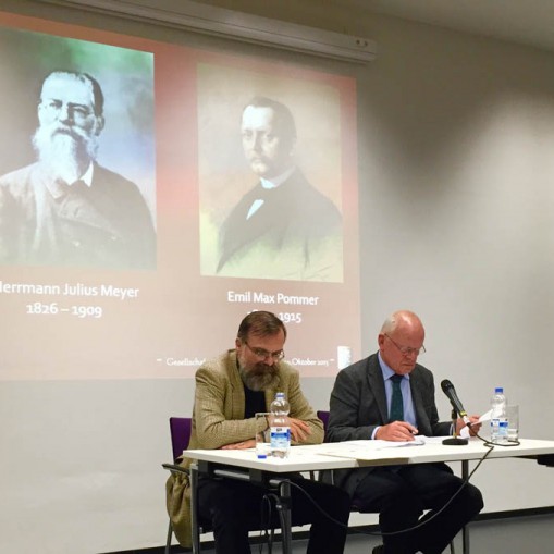 Im Huldenreich-Groß-Saal der Leipziger Stadtbibliothek lasen Dr. Stefan W. Krieg von Hösslin (links) und Dieter Pommer am 29. Oktober 2015 aus dem Briefwechsel zwischen dem Architekten Max Pommer und seinem Auftraggeber Herrmann Julius Meyer.