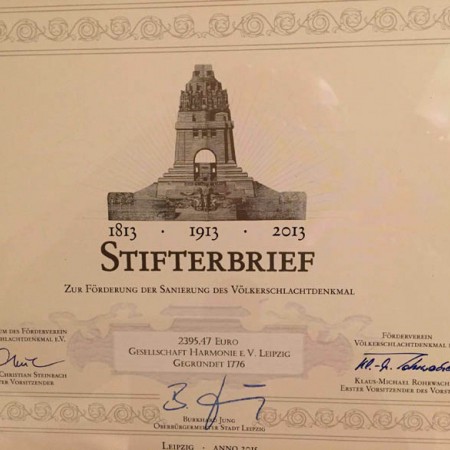 Der Leipziger Oberbürgermeister Burkhard Jung, selbst Ehrenmitglied der Gesellschaft Harmonie, übergab am 30. Oktober 2015 im Völkerschlachtdenkmal zahlreiche Stifterbriefe an neue Erwerber, darunter Privatpersonen, Unternehmen und Vereine.